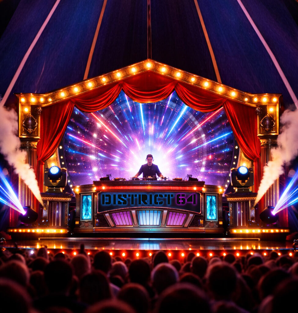 Im Schwanengraben von Babenhausen öffnet sich die Manege der Circus Stage. Direkt am Schloss erhebt sich das Zirkuszelt von DISTRICT64 – ein Ort, an dem Beats, Licht und Crowd zu einer einzigartigen Festivalatmosphäre verschmelzen.